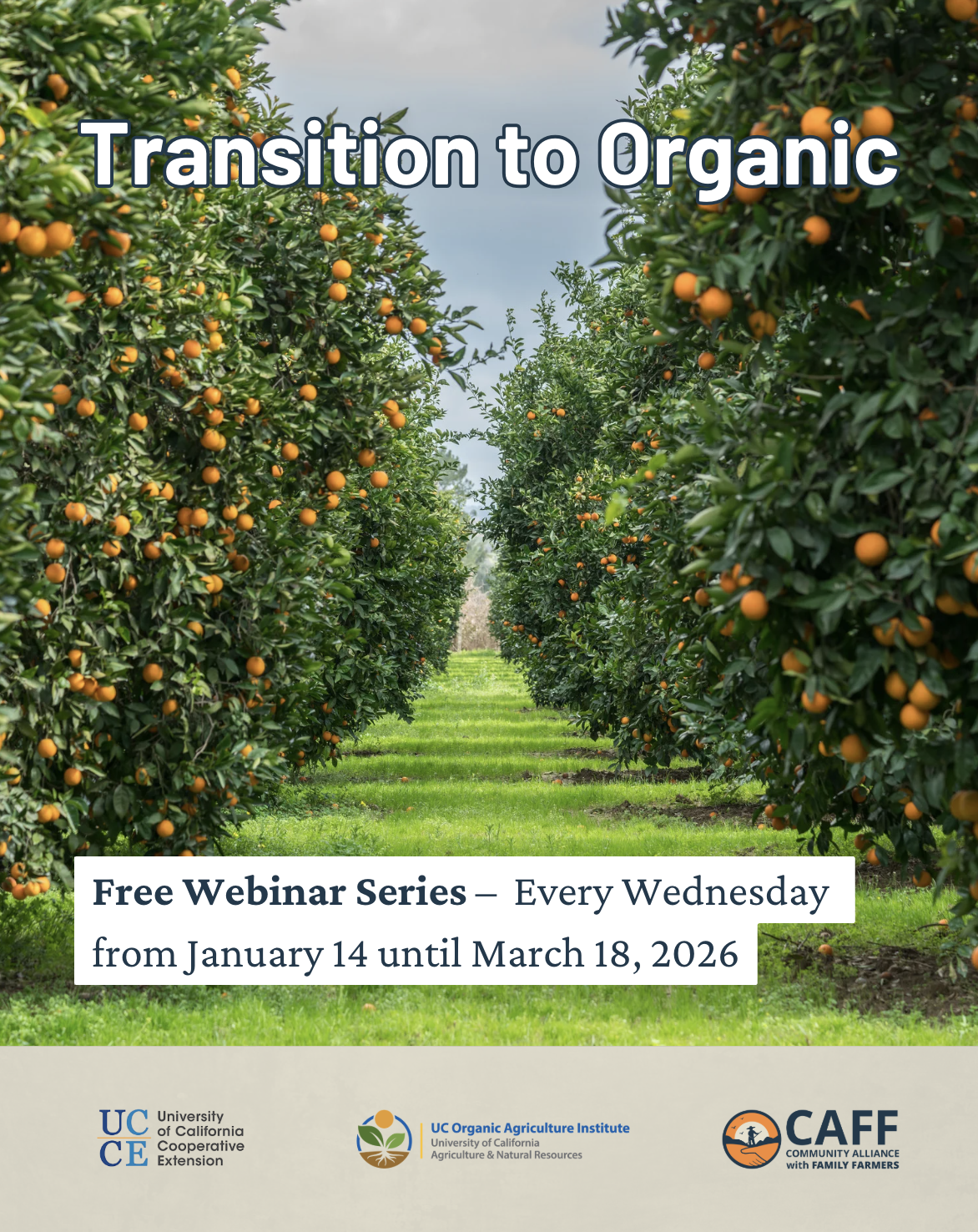 Spanish and Hmong interpretation will be available at every session. Each presentation and Q&A is followed by optional office hours 1:15 pm - 2 pm. Hosted by CAFF, UC Organic Agriculture Institute (UC OAI), and UC Cooperative Extension (UCCE).